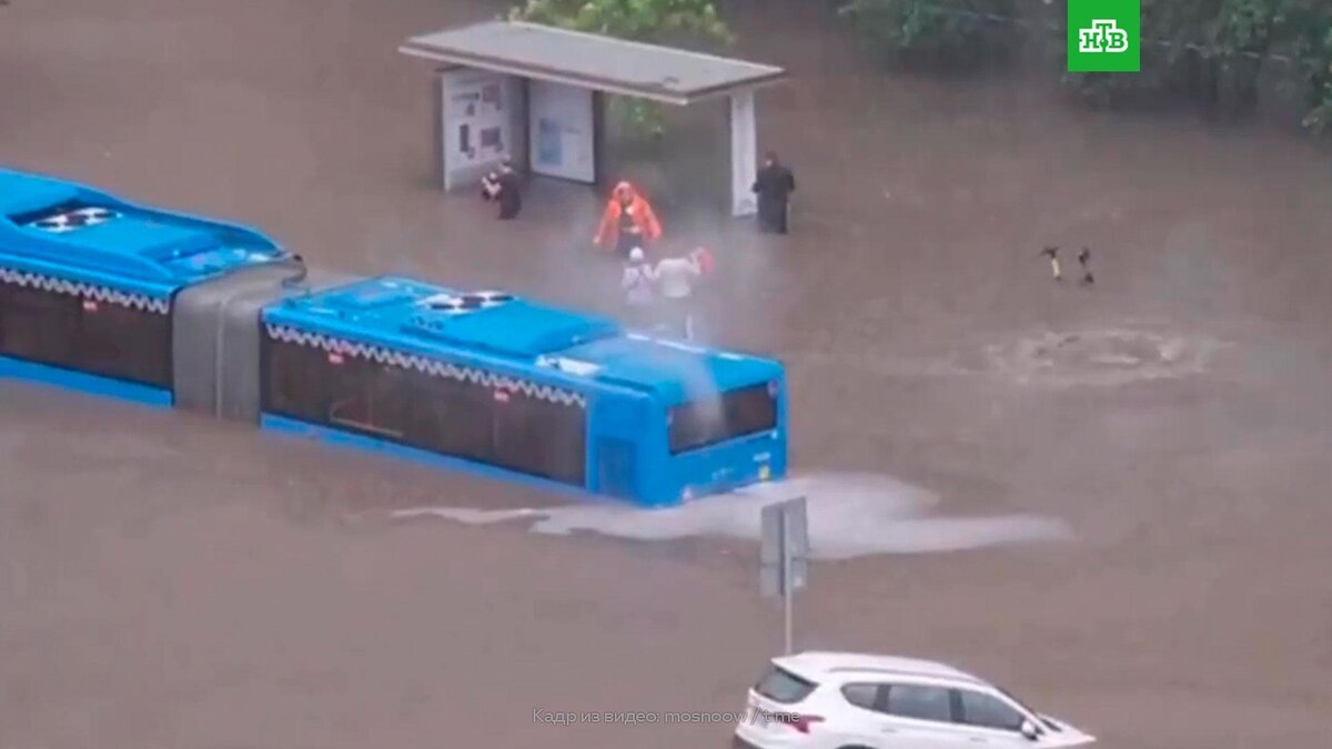 [ Смотреть видео на сайте НТВ ] В Москве бушует непогода, на дорогах подтопления. Из-за воды транспорт не может продолжать путь. Ливень подтопил улицы на севере Москвы. Вода залилась в салоны нескольких автобусов и легковушек — десять человек пришлось спасать. На Клязьминской улице из-за обилия воды движение перекрыто вовсе, там тоже «утонул» автобус. А на участке Филёвской линии метро между станциями «Багратионовская» и «Кунцевская» не ходили поезда. В настоящее время движение уже восстановлено. В Москве действует «оранжевый» уровень погодной опасности. Как ожидается, сверхинтенсивные осадки продлятся до конца дня. Горожан просят отказаться от поездок на личных машинах. По материалам: ТАСС. [ Смотреть видео на сайте НТВ ]