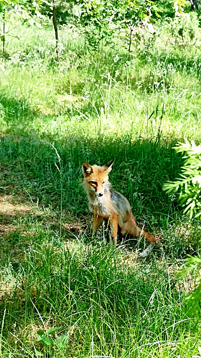 Животное в процессе линьки, поэтому выглядит не очень, но глазки смышленые и любопытные. Чувствуется, что людей не боится, привычная, и привыкла получать еду от людей. Хотя везде есть плакаты, что кормить животных нельзя. Но как тут удержаться, когда такие глазки на тебя смотрят, тем более, что есть подозрение, что где-то её ждут маленькие лисята, которых нужно покормить молочком.