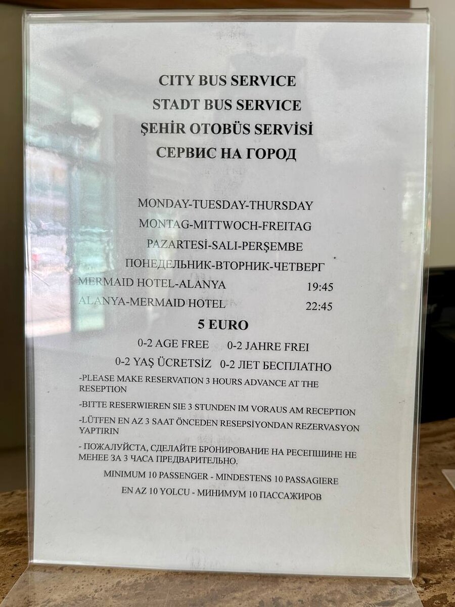 До Алании 16 км, отель предлагает трансфер по понедельникам, вторникам и четвергам стоимостью 5 евро. Так же рядом есть магазин с товарами первой необходимости, аптека и базар.