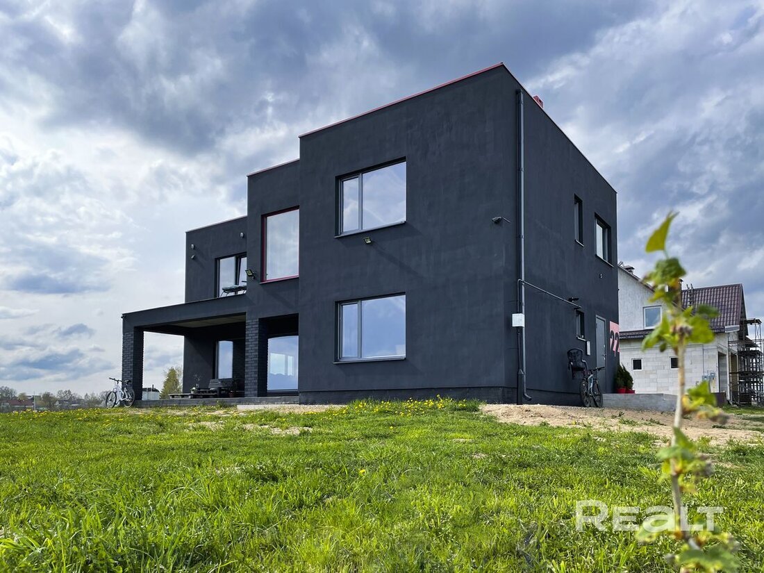 Нравится современная архитектура, панорамные окна и плоские крыши? Тогда вот вам достойный вариант в продаже на Realt – большой дом рядом с Заславлем, полностью готовый к проживанию. Главные его фишки – стильный интерьер, мастер-спальня с ванной у окна и богатое инженерное оснащение. Смотрим, прицениваемся. Расположен дом в Недреске – деревне с коттеджной застройкой между Заславлем и «Линией Сталина». До метро «Каменная Горка» можно добраться всего за 15 минут, ходят автобусы и маршрутки, в соседней Хмелевке – остановка электрички. Дом построен по современному проекту, два этажа, плоская крыша (эксплуатируемая), панорамные окна. Фасад выкрашен в темно-серый цвет, разбавленный розовыми элементами в виде оконного профиля, нарисованного под трафарет номера, окантовки парапета крыши. Все выглядит как минимум необычно. Общая площадь дома 190 квадратов, год постройки – 2020 год. По проекту к строению должен примыкать гараж, но по факту имеется только его фундамент. Впрочем, жилая часть уже п