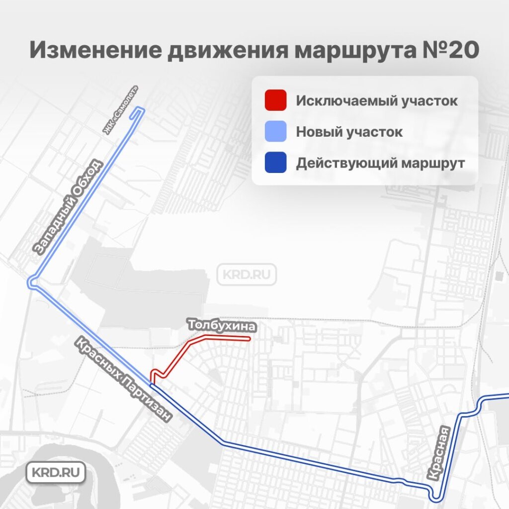 Автобус № 20 теперь будет курсировать от ЖК «Самолёт» по улицам им. Дмитрия Есаулко, Западному Обходу, Красных Партизан и далее до посёлка Плодородного. Новая схема движения исключает заезд на улицу им. Толбухина, 2.