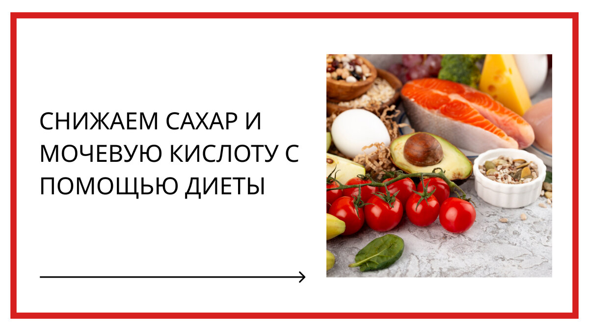 СНИЖАЕМ САХАР И МОЧЕВУЮ КИСЛОТУ С ПОМОЩЬЮ ДИЕТЫ Часто у пациентов с избыточным весом, инсулинорезистентностью и/ или сахарным диабетом 2 типа встречается повышенный уровень мочевой кислоты. При составлении диеты в таком случае нам следует ориентироваться на правила питания при обеих патологиях. Но вы, наверное, заметили, что диеты при подагре и диабете во многом противоречат друг другу. Возникает логичный вопрос: КАК ПИТАТЬСЯ ПРИ ДИАБЕТЕ И ПОДАГРЕ? ГЛАВНЫЕ ПРАВИЛА ПИТАНИЯ ПРИ ИНСУЛИНОРЕЗИСТЕНТНОСТИ/ САХАРНОМ ДИАБЕТЕ И ПОВЫШЕННОМ УРОВНЕ МОЧЕВОЙ КИСЛОТЫ: 🔰 МЕДЛЕННЫЕ УГЛЕВОДЫ (цельнозерновые каши, черный хлеб, макароны из твердых сортов пшеницы) мы кушаем небольшими порциями преимущественно в первую половину дня. 🔰 БЕЛОК. Отдаем предпочтение нежирным сортам: яйца, курица, индейка, рыба, кролик, морепродукты. Избегаем наваристых мясных и рыбных бульонов, избегаем употребление субпродуктов. Красное мясо (говядина, баранина) максимально ограничиваем. Копчености, консервы ограничиваем.