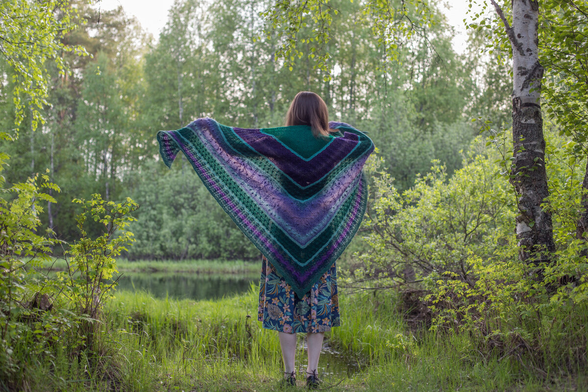 Несмотря на то, что весна у нас в этом году была поздняя, да и лето только-только входит в свои права, я со своими вязальными проектами опаздываю ещё больше, и в пору, когда вокруг уже вовсю отцветают сады - пришла показать вам "Первоцветы". Я начинала вязать эту шаль в мае, когда только-только рассыпались по оттаявшим островкам земли яркие огоньки первых весенних цветов, да так и легло на душу это название. Шаль связана по МК Влады Любутовой , пряжа Дундага 6/1, спицы №3,25. Размах крыльев шали 202 см, длина по спинке 109 см, вес 275 грамм. Дом нашла. Здесь использованы несколько разных пасм: и артистики, и мультитвид и готланд. У меня, видимо, настал такой период, когда я перестала беречь сложенные в шкафу плотненькие пасмы Дундаги на "когда-нибудь", и не жалея разматываю их теперь, "доставая" нужные цветовые секции под текущий проект. (А что делать с оставшимися клубочками, я подумаю потом). Лето, между тем, несётся в горку, к самой короткой ночи и самому длинному дню, картинки во