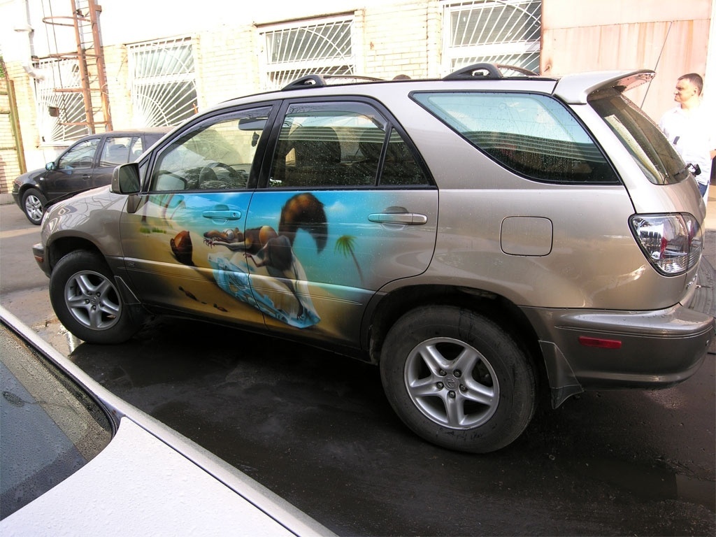 Девять ключевых этапов создания рисунка на автомобиле. На примере Lexus RX300 с композицией «Ледниковый период». Первый шаг — разработка идеи будущего рисунка. Дизайн-проект (эскиз) может быть выполнен от руки, описан словами или создан в графическом редакторе, например, Фотошоп (Photoshop). Главное — точно передать замысел и согласовать его с заказчиком. ⚠️ Важно: Все работы должны выполняться опытными специалистами в условиях автосервиса. Перенос рисунка с дизайн-проекта на автомобиль. Ориентируясь на утверждённый дизайн-проект, на кузов переносятся основные контуры композиции. Важно точно соблюсти масштаб и пропорции, определить места для главных и фоновых элементов. На этом этапе художник прорабатывает наиболее значимые детали композиции (первый план). Это задаёт характер и настроение всей работе. Окончательная проработка всех деталей, включая тени, блики и мелкие элементы. Изображение обретает завершённый вид. Старая защитная плёнка и бумага удаляются, автомобиль тщательно очищает