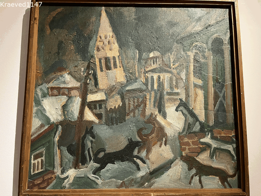 Дано: город Солигалич Костромской области с древней историей, былым богатством и процветанием, промышленностью и патриархальным укладом. В настоящее время прозябает в забвении. Редкого туриста туда заносит нелёгкая. Летом, конечно, туристическая жизнь повеселее. Зимой примерно вот так. "Ночь, улица, фонарь, аптека".... Вернее: ночь, тьма, мороз, собаки. Ночной пейзаж выполнил советский художник Николай Андронов, назвал его "Ночь в Солигаличе". Точный год создания не известен. На этикетке дипломатично написано 1968-1981 год. Но с живописцами такое часто встречается. Начал что-то писать, забросил, потом вспомнил, что-то добавил, а завершил много лет спустя.... Увидела я картину на выставке "Москва - Ереван - Москва". Наверное, прошла бы мимо... Но вдруг узнала панораму Солигалича! В первую очередь - Гостиные ряды. Колокольню тоже помню. Дома подняла фото-архив и стала сравнивать виды Солигалича с тем, что изображено на полотне Андронова. Ещё раз дублирую картину. Обратите внимание
