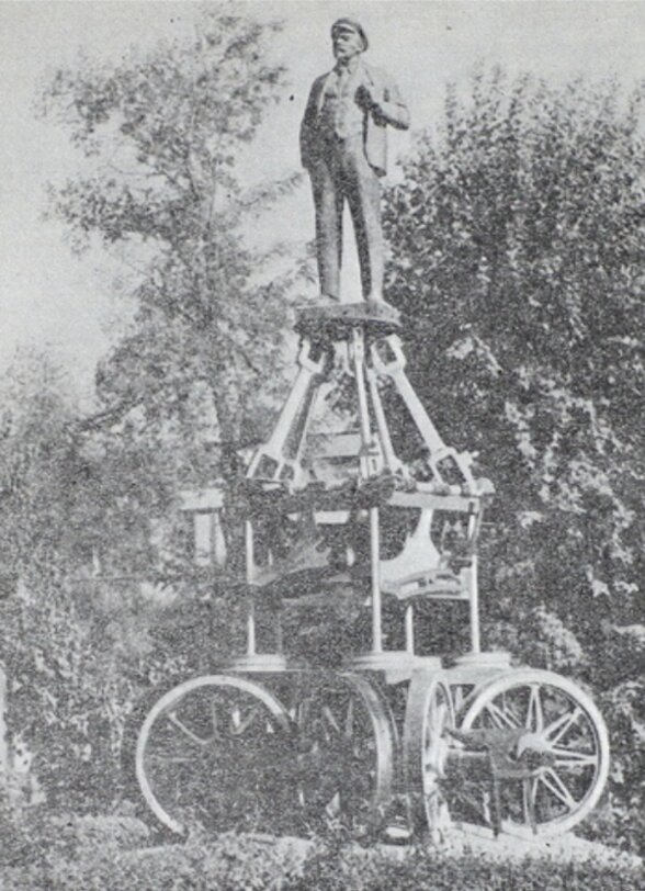 В октябре 1924 года, к седьмой годовщине Октябрьской революции и в год смерти Владимира Ильича Ленина, железнодорожники Ташкента решили увековечить его память. Они воздвигли памятник на территории Ташкентского тепловозовагоноремонтного завода имени Октябрьской революции. Этот памятник был особенным: его создали железнодорожники своими руками, по собственному проекту и без затрат государственных средств, что делало его собственностью профсоюзного комитета. Это был настоящий "рабочий почин" — инициатива, исходившая непосредственно от трудящихся¹. Памятник представлял собой бюст Ленина работы известного скульптора С.Д. Меркурова, установленный на шаре, символизирующем планету. Постамент украшали пять рычагов от паровоза, символизирующих двигательную силу пролетариата и идеи ленинизма. Эта конструкция передавала движение регулирующим кулисам, соединенным с поршнями, олицетворяющими двигательную силу истории, партии и рабочего класса. Все это стояло на колесных парах, расположенных квадр