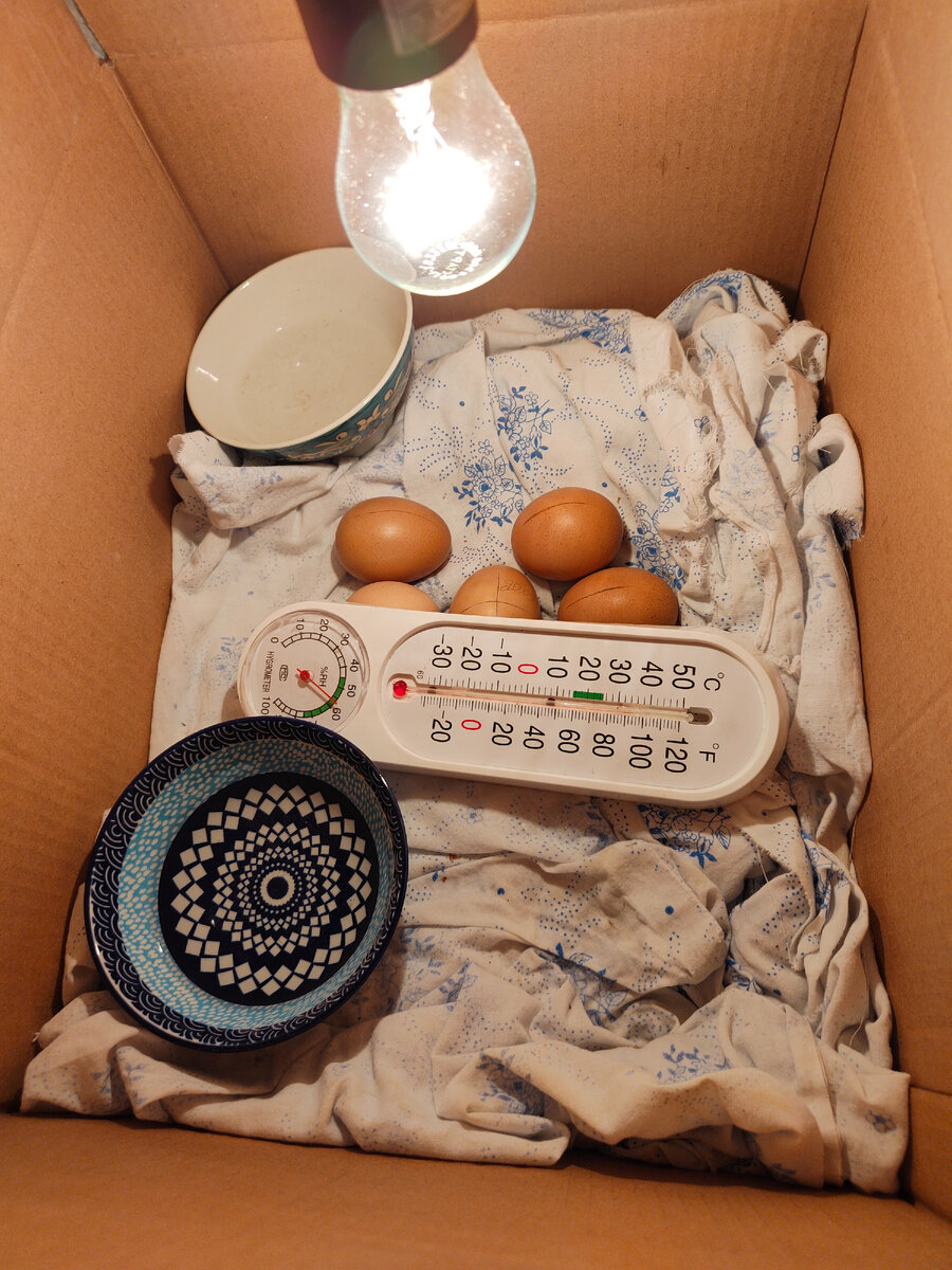 Вот и прошло 22 дня с того момента как мы заложили яйца в наш самодельный инкубатор. На сегодняшний день уже можно подвести промежуточные итоги. Кто не читал, или читал, но забыл, напомню, что раз так получилось, что в нашем хозяйстве произошло пополнение в виде петуха, мы решили поэкспериментировать и вывести цыплят в обычной картонной коробке. Интересно то, что у нас три вида кроссов и какие могут получиться цыплята - загадка. Всего мы заложили 7 яиц. По истечении четырех дней после закладки мы просветили яйца, все они оказались с зародышами, это хорошо. Время от времени мы продолжали их просвечивать, во всех яйцах развитие происходило нормально. Весь процесс однообразен и практически неизменен, нужно обязательно переворачивать яйца по часам и следить за температурой и влажностью. На 20-й день внутри некоторых яиц стали слышны попискивания. На 21-й день птенцы стали вылупляться. Первый цыпленок оказался темного цвета и вылупился достаточно уверенно. Следом за ним начал вылупля