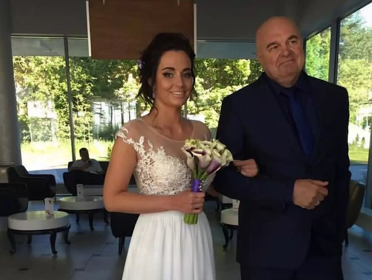 На снимке девушка стоит рядом со своим отцом. Она одета в белое платье невесты и держит в руках букет. Загорелая кожа певицы создает контраст с ее нарядом. Волосы Дарьи собраны назад.