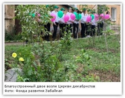 Студенты-волонтёры и преподаватели Читинского политехнического колледжа благоустроили двор — провели ландшафтную реконструкцию и озеленение — рядом с Церковью декабристов в Чите. Работы велись в рамках проекта "С Читою связаны судьбой". Об этом сообщает ИА ChitaMedia со ссылкой на пресс-службу Фонда развития Забайкалья. Рядом с церковью были установлены скамейки, стенды, фонари, ротонда, высажены декоративные деревья и кустарники, в альпинарий посадили цветущие многолетники. Однако увидеть, как преобразилась территория можно только через 3-5 лет, когда растения наберут полную силу. "Благодаря конкурсу грантов губернатора мы реализовали первые мечты п благоустройству этого участка. Студенты теперь будут уход за этой площадкой передавать последующим поколениям как эстафетную палочку", — добавила Людмила Емельянова.