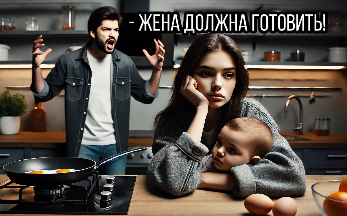 Марина гуляла с ребенком и закупалась продуктами, а Дима остался дома отдохнуть в выходной день. Их не было 3 часа, перед выходом все поели, включая Диму. По возвращении ребенок сразу попросил есть, и Марина легла покормить его грудью. В этот момент Дима сказал: "Я очень голодный, сделай что-нибудь быстрое, и я поеду в компы". Марина спросила, почему он не мог приготовить себе поесть, пока её не было, но Дима проигнорировал вопрос и лишь повторил свою просьбу. Зная, что еще пару минут, и Дима начнет психовать, Марина попыталась встать, но ребенок не отпустил, и она вздохнула. На этот вздох Дима распсиховался и сказал: "мне еда из одолжения не нужна". Он пошел к холодильнику, посмотрел и ушел курить. Вернувшись, Дима увидел, что Марина не стоит у плиты, и продолжил психовать: "Я что, не заслужил, чтобы мне жена приготовила ужин?" Марина сказала, что сейчас сделает, но Дима велел ей заткнуться и с истерикой начал готовить яйца. Марина ушла с ребенком в комнату, но позже вернулась за водо