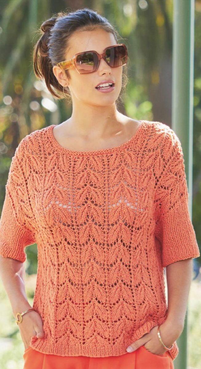 Готовый летний бестселлер - пуловер прямого покроя из биохлопка с воздушным узором в виде листьев. Интересный прием: проймы небрежно приспущены, а короткие рукава связаны резинкой.