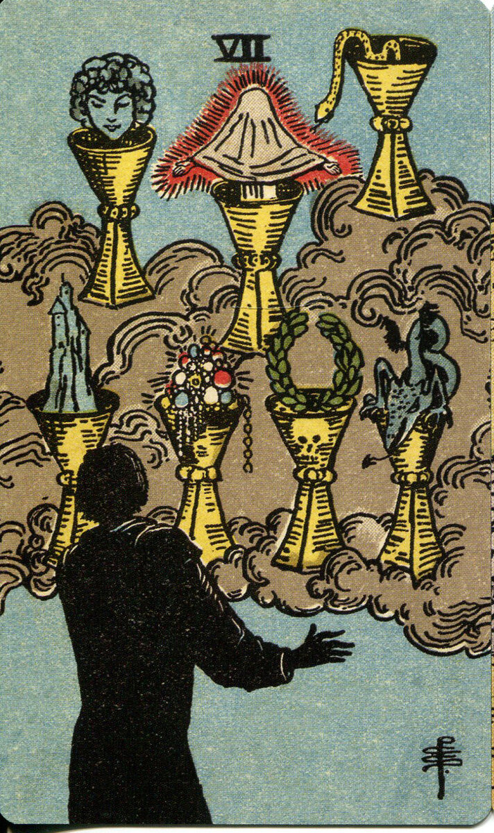 7 кубков: мы видим, как человек у недоумении смотрит на все 7 кубков разных и все ему хочется. Основное значение карты: «хочу все и сразу», но выбрать надо что-то одно. Осложняется выбор человека тем, что он сам не знает, что хочет в текущий момент. Кубки на карте, как фантастические мечты, иллюзии, воображение человека. Поэтому посыл карты: ИЛЛЮЗОРНОЕ ВОСПРИЯТИЕ. Например, человек, хочет пойти в бизнес или впервые работать в онлайн - сферу на себя и выпадает перспектива 7 кубков. Это значит человек в своей голове придумал некий идеальный образ, как должно это выглядеть, какая прибыль, как все хорошо и складно будет получаться. И он на самом деле не чувствует или не знает (не предполагает) с какими трудностями он может столкнуться, что у него нет четкого плана «что делать», как искать клиентов, как раскручивать трафик, как улаживать какие-либо бюрократические вопросы (налоговая, например), и нет РЕАЛЬНОГО представления в этой сфере/ в начале пути бизнеса/ смены работы. Основное значе