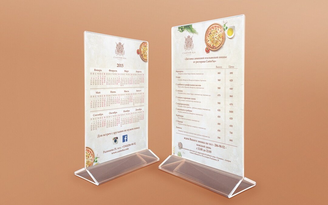 Тейбл тент с английского переводится как «настольный шалаш». Этими словами легко описать всю конструкцию: тейбл тент выглядит как треугольный домик, который ставят на стол. Классический тейбл тент – это «шалаш», лист бумаги с двумя сгибами и склеенными краями. Иногда вместо склеивания выбирают замок с прорезями. Главное преимущество полиграфии – она стоит на столе, буквально перед глазами покупателей, не заметить ее крайне сложно. Конструкция привлекает внимание людей, особенно есть выполнена в цветном виде. Тейбл тент бывает рекламным или информационным, его используют в кафе и ресторанах, в гостиницах, в приемных, на мероприятиях и выставках. Используют офсетную или цветную печать: первая дает более насыщенные цвета, особенно при печати фотографий, вторая дешевле и быстрее. Дополнительно выбирают постпечатную отделку: тиснение, золочение, частичное ламинирование, фактурное лакирование, фигурную вырубку. Размер тейбл тентов зависит от предпочтений клиента: стандартные размеры (А4 и А5