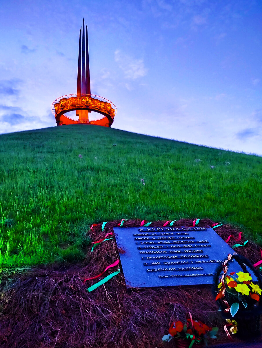 На склоне Кургана Славы находится мемориальная плита с надписью: У Кургане Славы жменя да жмені лягла зямля з гарадоў-Герояў і іншых месц жорсткіх баёў, з гарадоў і сёл, якія навек праславілі сябе ратнымі і працоўнымі подзвігамі дзеля свабоды і незалежнасці Савецкай Радзімы.