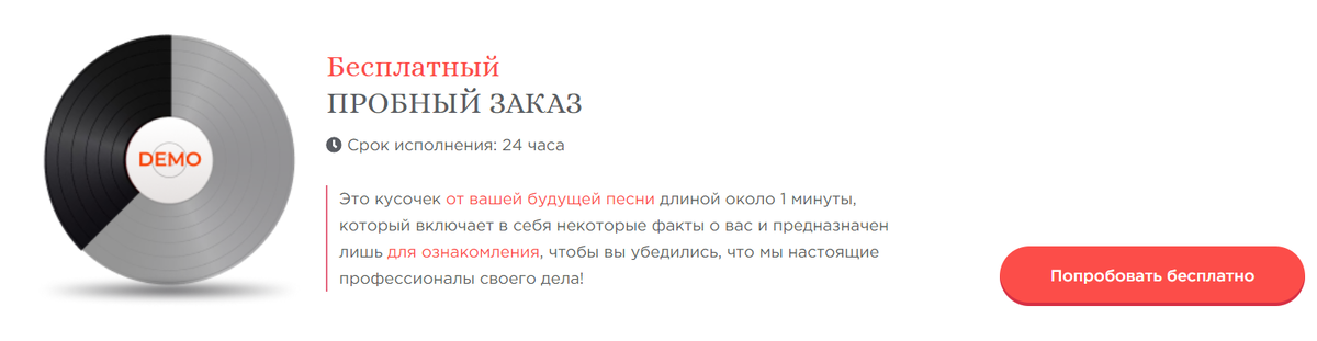 Менеджер отправил мне анкету и я быстро заполнила ее. Потратила, кстати, от силы минуты 4… Всё емко и очень просто. А вот оставляю ссылочку на ту самую анкету на оформление бесплатного пробного заказа: podari-track.ru. И уже через 24 часа мне должны были отправить тот самый отрывок моей будущей песни…