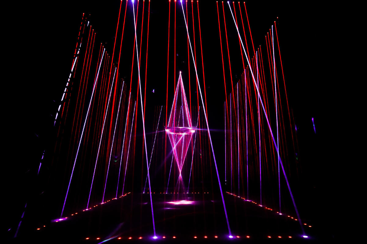 Техническая суть инсталляции – работа со светом в пространстве с преломлениями, с насеиваниями, с фокусами. Сетап состоит из чёрной комнаты, чёрного полотна, среди которого расположены магические приборы. Самый главный герой – волшебный лазер. По периметру расположены лазербары и прекрасные монолазеры. Все взаимодействуют со средой и линзами. Сам по себе лазер главный и так мощный инструмент, который ограничен, по сути, только твоей фантазией: что ты хочешь нарисовать? Он способен на любые эффекты, всё можно анимировать и оживлять, комбинируя составные эхффекты. А мы ещё добавили работу с преломлениями, что ещё больше расширило горизонт и дало нам очень много свободы. Можно сказать, у нас были бесконечные инструменты: кристаллы, линзы, сами источники, которые могли менять своё положение в пространстве. Безграничное поле, в котором мы работали.
