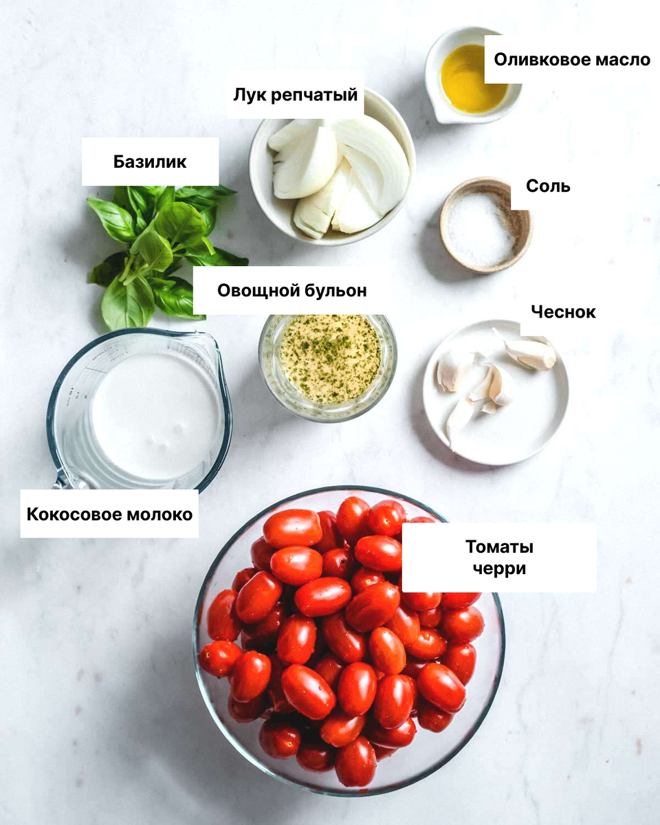 Дорогие любители вкусной еды, представляю вам яркий летний суп, приготовленный из свежих помидоров черри и нескольких простых ингредиентов. Ингредиенты Состав: Рецепт Разогрейте духовку до 200 °C. Подготовка. Помойте и просушите помидоры. Нарежьте лук полукольцами. Отделите 4 зубчика чеснока (очищать от кожуры не нужно). Шаг 1. Застелите противень пергаментной бумагой. Добавьте помидоры черри, нарезанный лук, соль и оливковое масло и перемешайте. Шаг 2. Добавьте чеснок в противень. Шаг 3. Запекайте овощи в течение 40 минут, пока помидоры не станут мягкими и не обуглятся. Шаг 4. Достаньте противень из духовки и дайте овощам немного остыть. Подготовьте блендер и емкость в которой будете перебивать овощи. Очистите чеснок и добавьте его вместе с содержимым лотка в емкость. Добавьте кокосовое молоко, овощной бульон и свежий базилик. Шаг 6. Все перебейте блендером до однородной массы. Попробуйте и отрегулируйте соль. Если суп слишком густой, разбавьте его кокосовым молоком или овощным б