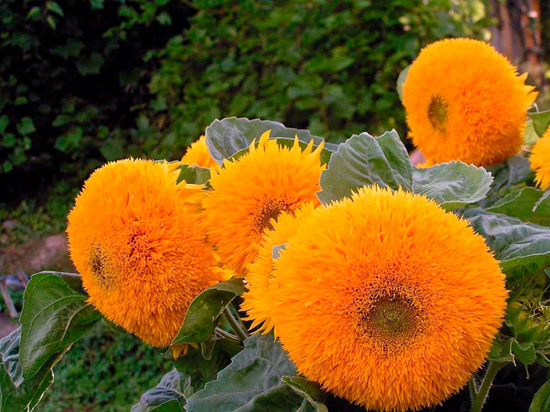 Пушистые махровые цветки сорта Teddy Bear не могут не радовать глаз. Желтые помпоны этого подсолнечника покорили сердца садоводов и завоевали популярность благодаря своему необычному внешнему виду. Их часто используют для посадки на клумбы или в открытый грунт, где они гармонично дополняют цветочные композиции. Внешние характеристики подсолнечника Медвежонок Этот низкорослый декоративный подсолнух вырастает до 60 см в высоту. Центральный ствол растения достаточно гибкий, на нем также располагается небольшое количество боковых побегов. Большие листья сорта Teddy Bear имеют овальную или сердцевидную форму. После набора зеленой массы куст разрастается до 0,3-0,6 м в объеме. В период цветения подсолнечник покрывается крупными бутонами, которые в среднем достигают 10-15 см в диаметре. Густомахровые цветки имеют насыщенную желто-оранжевую расцветку, что позволяет им ярко выделяться на фоне темной зелени. Особенности и интересные факты Teddy Bear Сорт Медвежонок получил свое название благодар
