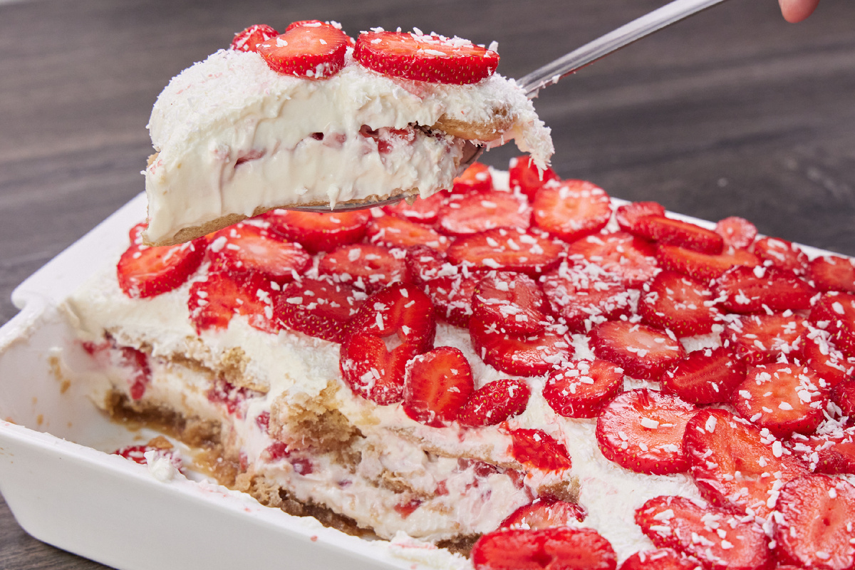 Кокосовая стружка 50 г Понадобится прямоугольная форма с глубокими бортами 30 на 20 см 1. Холодные сливки взбить миксером с веничками до плотных пиков. 2. Маскарпоне смешать в отдельной миске с сахарной пудрой до однородности. 3. Отправить к маскарпоне часть сливок и перемешать лопаткой, отправить ещё часть сливок, перемешать. Добавить оставшуюся часть сливок, перемешать. Совет от шефа: «Взбитые сливки отправлять в маскарпоне нужно частями для того, чтобы получилась воздушная масса». 4. Клубнику (500 г) нарезать небольшими кубиками, оставить 200 г клубники для украшения. 5. Кофе остудить до комнатной температуры, отправить 4 ст. ложки кокосового ликёра и перемешать. Совет от шефа: «Для детей в десерт можно не добавлять ликёр, кокосовая стружка даст правильный кокосовый вкус». 6. Печенье окунуть в кофе со всех сторон в течение 4