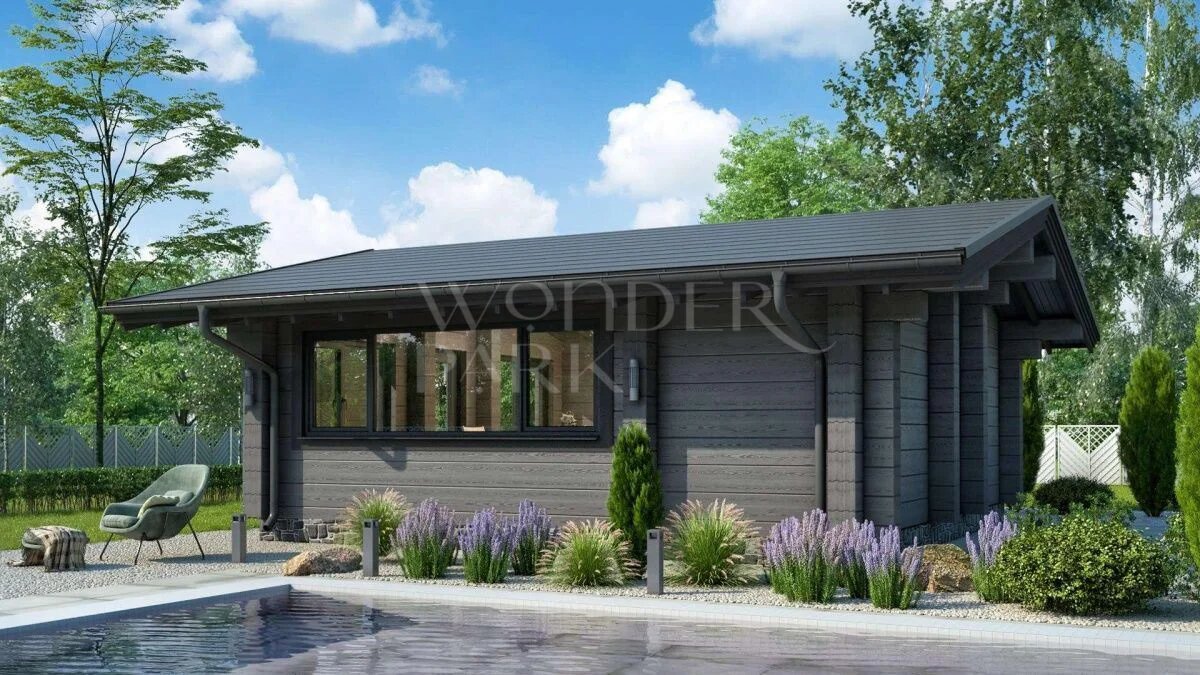 Проект современного дома-бани в финском стиле из клееного бруса. Отличительной особенностью данного проекта от популярных бань из бруса является панорамное остекление в комнате отдыха.