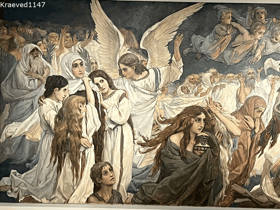 Сюжет, о котором пойдёт речь имеет двойное называние - “Радость праведных, о Господе” и "Преддверие рая". Не так давно я показывала музыкальный ролик, сделанный на экспозиции, посвящённой росписям Владимирского собора. Эта работа взволновала меня до глубины души и я решила разобраться, кто есть кто. Тем более, что на экспликации к картону почти все герои расписаны. Слева видим Веру, Надежду, Любовь и мать их Софью. Справа с распущенными волосами в тёмной тоге стоит Мария Магдалина. Обратите внимание на даму в палевом мафории (платке) справа. Ближе к центру видим благоразумного разбойника с крестом, а за ним праотцев - Еву, Адама и Авеля. На этом фрагменте крайней слева опять появляется эта дама. В центре композиции видим архангелов. За их спинами золотятся купола небесного града Иерусалима. Михаил, Гавриил и Рафаил встречают праведников у райских врат. Справа на композиции видим святую Варвару с мечом и святую Екатерину в царских одеждах. Обеих на крыльях несут ангелы. На след