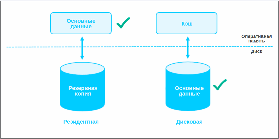Все резидентные базы данных поддерживают ACID-транзакции (Atomicity, Consistency, Isolation, Durability – атомарность, согласованность, изолированность, надежность) с дополнительными хитростями, которые обеспечивают надежность и предотвращают потерю данных в случае сбоя.