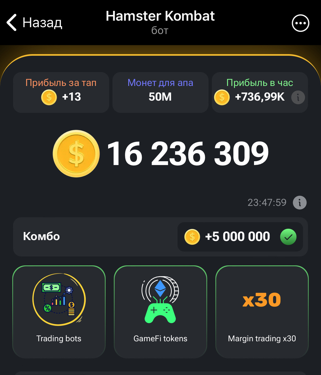 Комбо Hamster Kombat 14.06.24 Все 3 карты находятся во вкладке Markets и называются 1. Trading bots 2.GameFi tokens 3.Margin trading x30 Покупаем по 1 уровню, каждой карты, получаем комбо и лутаем 5 млн. монет!