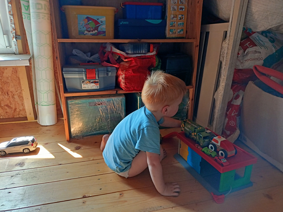 Продолжаю работать на чердаке. Теперь сюда можно брать с собой ребенка. Сыну4, кстати, на чердаке очень понравилось, так что первый этап назначается принятым комиссией после натурных испытаний. Переходим ко второму этапу - стенкам. Их необходимость зрела давно, но вяло. Т.е. понятно, что зашить стенки надо, потому что на чердаке пылища. Нет, не так, ПЫЛИЩА! Оно конечно, в городе экология плохая, не то что в деревне. Поэтому у нас на чердаке скапливалась пыль деревенская, которая возникает при большом количестве окрытого грунта. Пыль совершенно экологичная, но от этого не менее раздражающая: Конечно, периодически на чердаке делали уборку. Пылесос, в принципе, с пылью справлялся неплохо. Но ее количество, которое скапливалось за год раздражало. Это ведь не только полы грязные, это ведь и вещи, которые на чердаке лежат, такие же. Мы уже давно пришли к тому, что хранить надо в пакетах и коробках. И все равно, хотелось этот канал проникновнеия пыли прикрыть. Но останавливало соображение “п