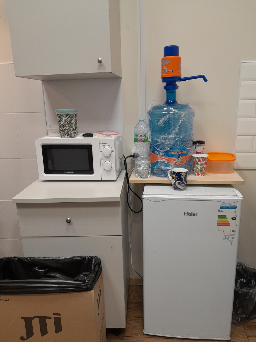 Мне показали комнату персонала, выделили шкафчик для вещей. Там можно убрать свою еду в холодильник, в обед разогреть ее в микроволновке. Условия хорошие. Санузел чистый, в наличие есть средства гигиены и т.п.