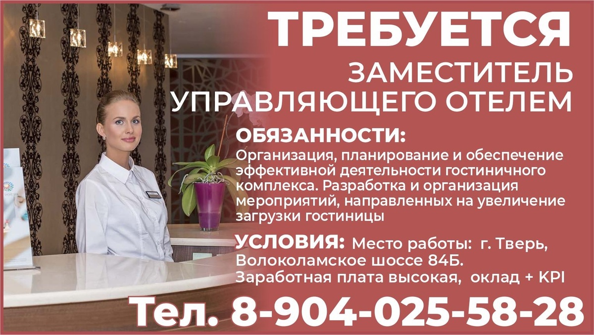 Обязанности Организация, планирование и обеспечение эффективной деятельности гостиничного комплекса Разработка и организация мероприятий, направленных на увеличение загрузки гостиницы Условия Место работы - г. Тверь, Волоколамское шоссе 84Б Заработная плата высокая, оклад + KPI тел 8-904-025-58-28 hr.temp21@mail.ru