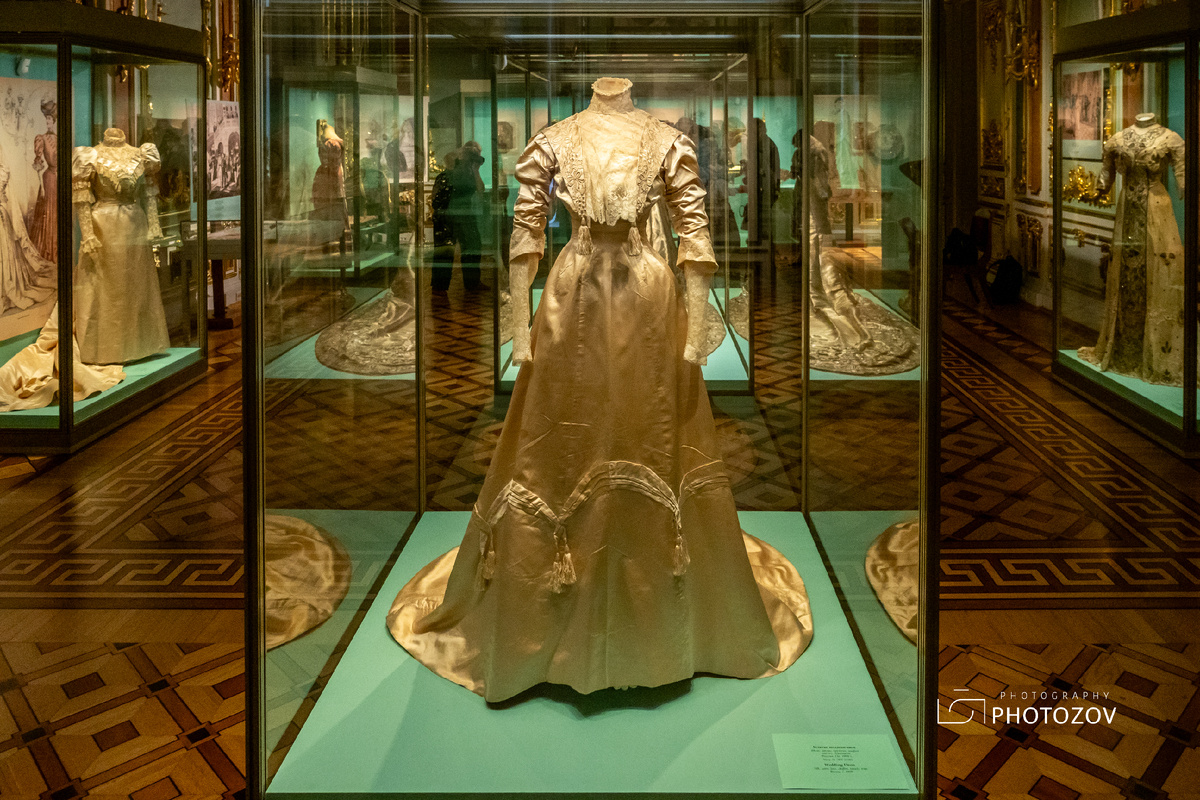 В Эрмитаже в Малой церкви Зимнего дворца проходит выставка о свадебных церемониях в России XIX - начала XX веков. Невесте полагалось быть одетой в белое платье, также считался допустимым цвет слоновой кости или золотистый. Если свадебный обряд совершался утром, то платье должно было быть высоким, с длинными рукавами. Подписывайтесь на мой канал, чтобы не пропустить что-то интересное и полезное. Вечернее венчание позволяло небольшое декольте и короткие рукава. К волосам невесты прикалывали фату, причёску и платье украшали померанцевыми цветами, чаще всего искусственными. Невесты императорских и великокняжеских дворов венчались в парадном придворном платье из серебряного глазета, расшитого серебряными нитями. На выставке представлен подобный наряд, в котором великая княжна Ксения Александровна выходила замуж за великого князя Александра Михайловича. Примечательный факт: платье весит больше 10 кг и когда великая княжна опустилась на венчании на колено перед патриархом, то встать самос