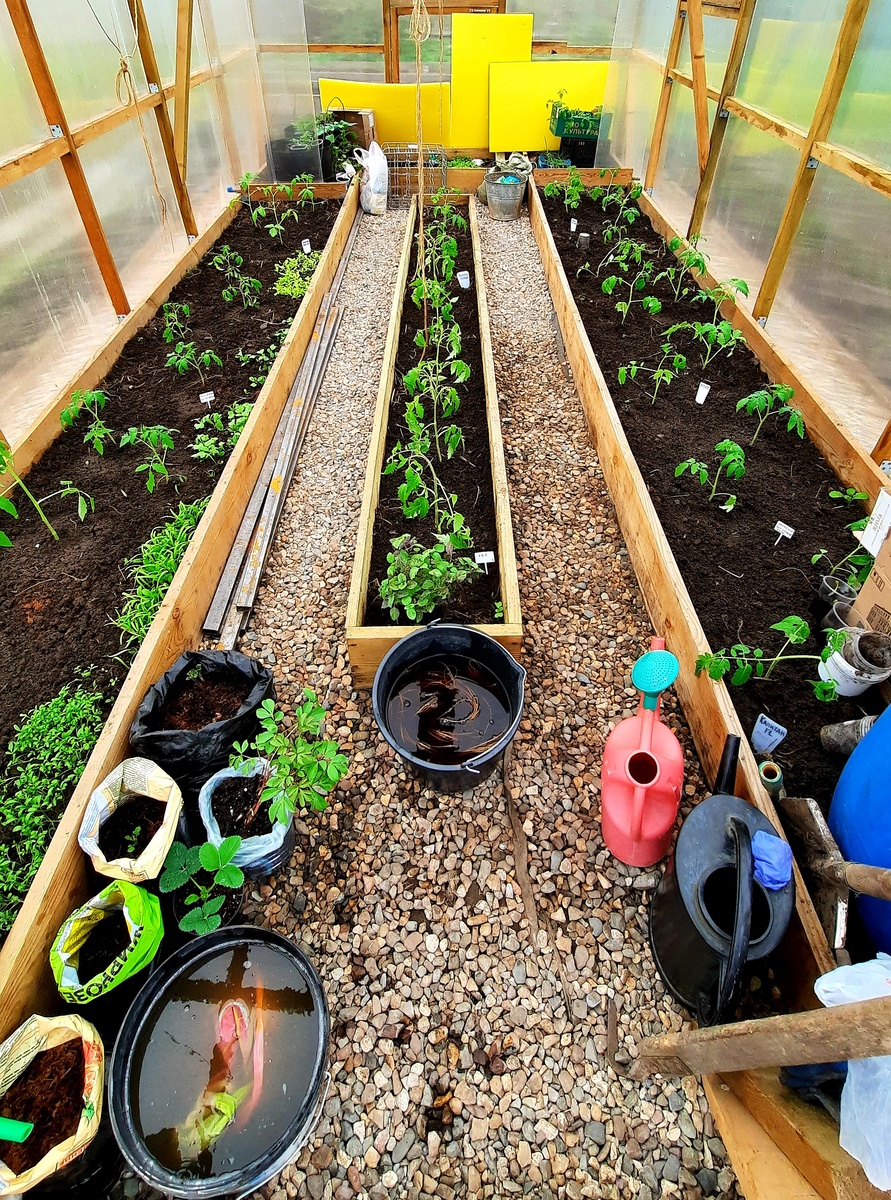 Эксперимент начат был 2 апреля: в теплице я разложила в пакеты с грунтом проросшие картофелины и сверху положила снег вместо полива, потому что я не собиралась приезжать туда две недели, как минимум. Я учла свои ошибки прошлого эксперимента, когда рано высадила картошку из пакетов в открытый грунт и заморозки побили у неё всю зелень, немотря на укрывной материал. Тем не менее, тогда суперранняя картошка всё равно удалась. В этом году я решила держать картошку в пакетах в теплице до настоящего тепла, а с ним как раз, были проблемы в этом сезоне. 22 апреля картошка только-только показалась: в левом углу теплицы стоят пакеты с ней👇 Я их поливала и подсыпала землю по мере их роста. После майских морозов, выставила их на улицу, закалила и высадила в грунт. При высадке , я один большой чёрный пакет оставила. Вот его-то я и решила вчера распотрошить ещё и потому что обнаружила там муравейник. Ещё обнаружила, что несмотря на полив и ливни, земля на 1/3 осталась сухая. А вообще, середина и