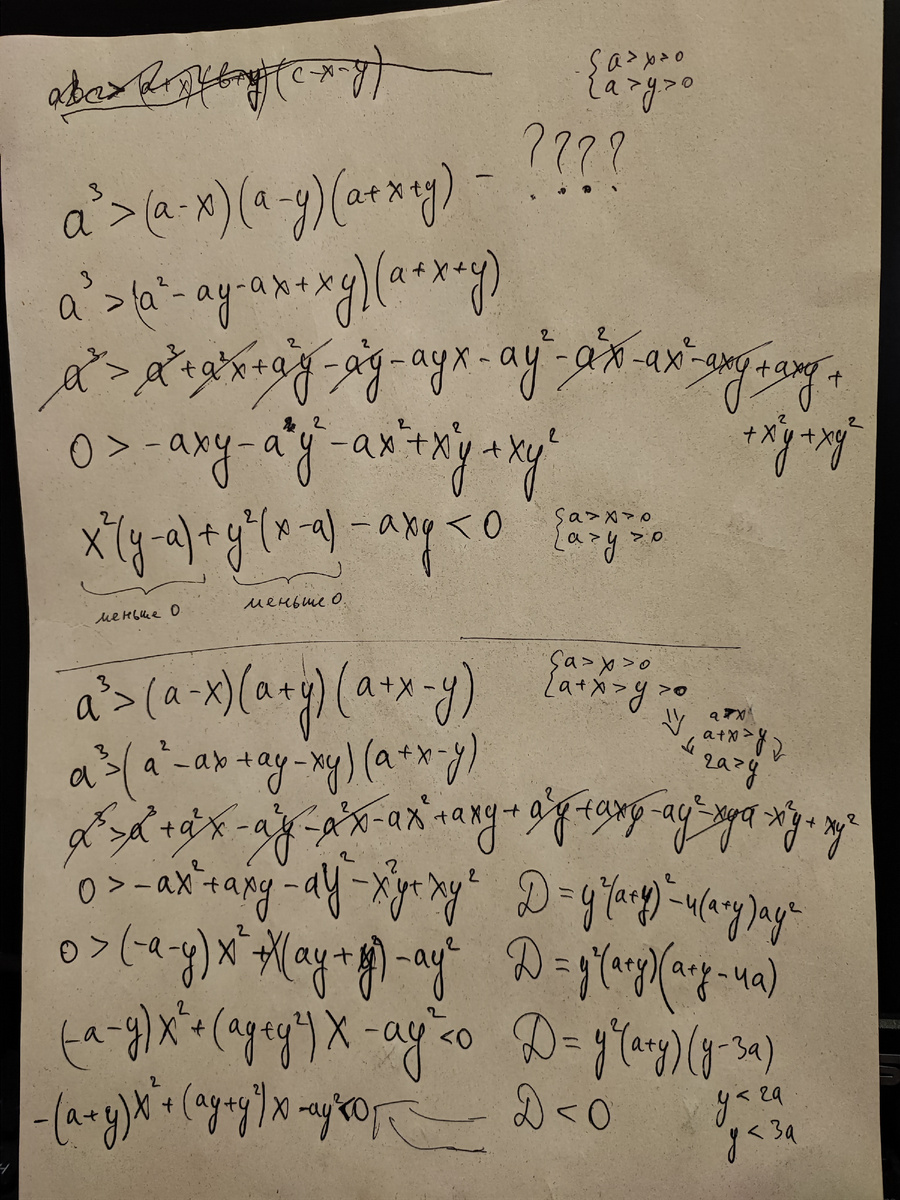 Доказательство того, что при заданной сумме трех положительных чисел максимальное значение их произведения будет достигаться при равенстве этих трех чисел. Аналогичное утверждение для двух чисел легко доказывается, для трех чисел - доказано при рассмотрении двух общих случаев. Сравнивается произведение трех одинаковых положительных чисел с тройкой других положительных чесел при условии сумма первых трех озвученных чисел равна сумме других трех озвученных чисел. Данное доказательство может быть использовано, например, для доказательства (через формулу Герона) того, что при заданном периметре максимальной площадью будет обладать равносторонний треугольник....