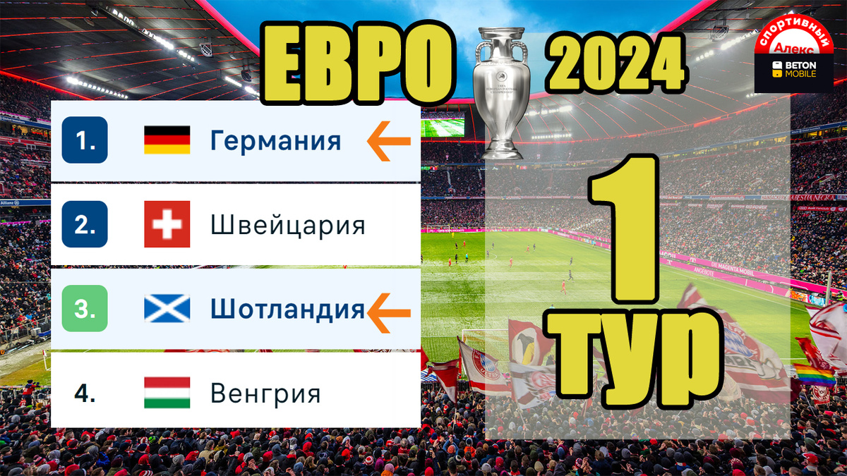 Здравствуйте, уважаемые любители футбола. Стартовал чемпионат Европы в Германии. Сегодня состоялся матч - открытие между хозяевами этого шикарного турнира и сборной Шотландии. Посмотрим этот результат, расписание завтрашних встреч и таблицу. Итак, в «квартете А» хозяйка Германия в замечательном городе Мюнхен встретится с Шотландией. Бундестим прогнозируемо захватил инициативу. Первый эпизод у ворот «тартановой армии» создан на 10-й минуте, он же завершился взятием ворот имени Вирца. До перерыва немцы ещё дважды огорчили голкипера гостей Ганна и впервые в своей истории забили в первом тайме чемпионатов Европы 3 гола. Сами же гости выходили на второй тайм в меньшинстве. После перерыва команда Нагельсманна отличилась ещё 3 раза, правда, один мяч Рюдигер срезал в собственные ворота. Бундестим начинает турнир с крупной победы 5:1. Таблица группы. Германия - 3 очка. Шотландия - 0 очков. Как вы знаете, тут выступают ещё Венгрия и Швейцария, у которых матч в запасе. Напомню, Германия - единст