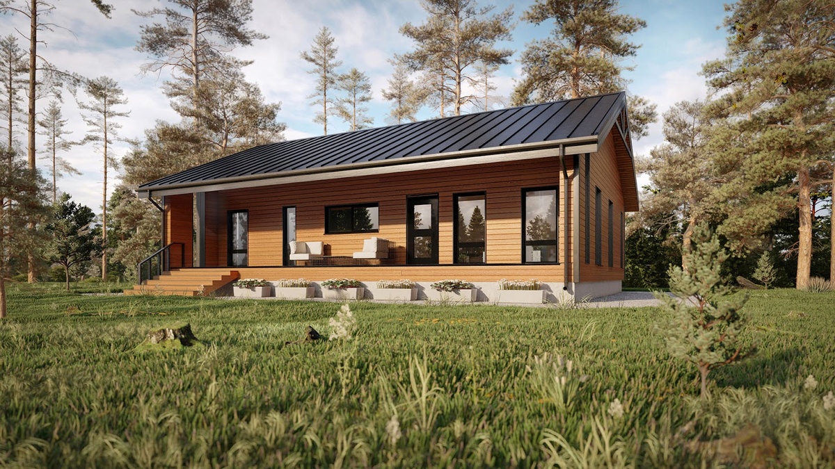 Обзор проекта одноэтажного каркасного дома с двумя спальнями Продолжаем цикл статей с обзорами проектов загородных домов. В рамках этого цикла каждому дому мы посвящаем две статьи. В первой рассматриваем проект дома — смотрим на экстерьер, изучаем планировку. Во второй — делаем примерный расчет стоимости свайно-винтового фундамента для такого дома. Ссылки на другие материалы цикла мы дадим в конце статьи, а расчет стоимости фундамент для дома из этого обзора опубликуем на следующей неделе. Герой сегодняшнего обзора — одноэтажный каркасный дом «Вега» от компании «Комплексное загородное строительство». Основная идея, которой следовал архитектор, — сохранение формы классического одноэтажного дома без выступающих элементов. Под одной двускатной крышей с основным внутренним пространством объединены терраса и входная группа. Выступают за этот периметр только ступени, которые спроектированы здесь довольно оригинально. Каркас дома выполнен из сухой строганной доски сечением 45 × 145 мм. Заполн