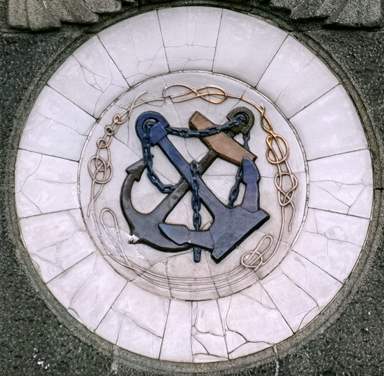 Продолжаем рассказ о нашей истории, отраженной в медальонах Северного речного вокзала. В этой статье медальоны четвертой колонны восточного фасада, выходящего в парк. Скульптура и роспись И.И. Ризнича Изображены два якоря разных типов – адмиралтейский и якорь Холла. Адмиралтейский якорь – приспособление, которое обеспечивает надежную стоянку корабля (судна) на рейде; удерживает на месте корабль (судно), стоящее одновременно на якоре (якорях) и на швартовых на глубинах до 150 м; служит одним из средств снятия корабля (судна) с мели; способствует управлению корабля (судном) в стесненных условиях плавания. Разработан в 1852 году Уильямом Паркером, названию он обязан Британскому Адмиралтейству. Он работал следующим образом. Якорь падал на дно и касался грунта пяткой тренда. Под натяжением якорного каната якорь ложился на грунт, и если его шток горизонтален, лапа зарывалась в него. Если же грунта касался конец штока, то под натяжением каната якорь поворачивался на нем, и лапа якоря входила