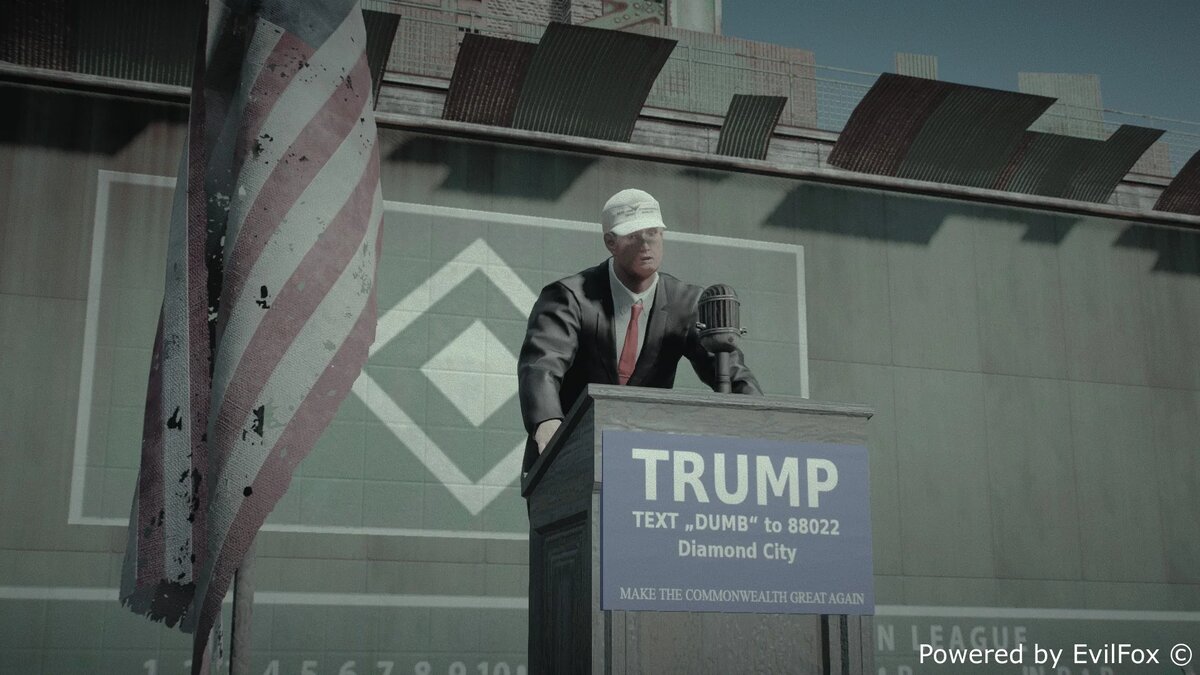 Встретить Трампа можно на сцене в Даймонд Сити во время одного из его спорных выступлений, где он предложит вам решить одну проблему. Сразу после выполнения квеста его можно взять в напарники и путешествовать по Содружеству в компании мемной легенды во плоти. Пусть он хватает Кюри за грудь и Пайпер by the pussy, пока вы будете строить великую стену вокруг своего поселения, чтобы отгородиться от рейдеров и гулей, которые уничтожают нашу экономику. ЧАВО: