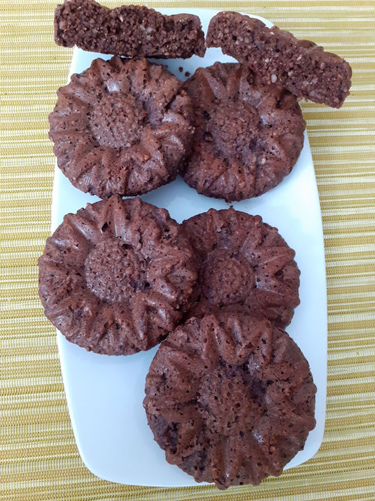 Легкое в приготовлении, обалденно вкусненькое, но весьма калорийное. Люблю орехи, люблю шоколад… Итак: ✔ Орехи - 250 г; ✔ Яйца - 3 шт.; ✔ Сметана- 3 ст. л.; ✔ Какао - 3 ст. л.; ✔ Сахзам - по желанию; ✔ Ванилин - 1 пакетик; ✔ 1ч. л. разрыхлителя; ✔ Соль - щепотка. Орехи (у меня смесь - грецкие, миндаль и арахис) смолоть в измельчителе. Добавить какао, сахзам, ванилин, разрыхлитель, яйца, сметану. Хорошо вымесить массу и разложить ложкой в формочки. У меня - силиконовые кексовые, я их заполнила на треть. И в разогретую до 180 градусов духовку на 15 минут. Из данной массы у меня получилось12 штук. На все приготовление у меня ушло не более получаса. КБЖУ на 100 г - 385/15,8/34,1/12,8. КБЖУ одного печенья (~40 г) – 154/6,3/13,6/5,1. От редакции: Печенье калорийное. Если есть проблемы с весом, то не увлекайтесь :) Примерный состав углеводов в орехах (на 100 г): всего углеводов – 10-11 г, из них моно- и дисахаридов – 3,5-4 г, крахмал – 6,5-7 г. Рецепт на странице Автор рецепта – Tatiana Azovo