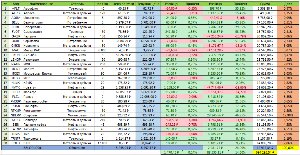 Приветствую вас на моем канале. Снова суббота, а это значит, можно подводить итоги прошедшей недели. И строить планы на следующую. Давайте этим и займемся. Итак, мой портфель, состоящий преимущественно из акций, выглядит сейчас вот так. В целом неплохо. В пятницу даже немного подросли. Не знаю, когда рынок начнет отрастать. Но когда-то точно начнет. А значит есть вероятность, что это локальное дно текущей коррекции, и есть смысл покупать акции, пока мы тут. Если посмотреть на мой портфель в разрезе секторов, можно увидеть следующую картину. Только сектор финансов в плюсе. Остальные в легком минусе. Скорее всего это происходит за счет Сбера, который просел гораздо меньше всех остальных. Никто не хочет продавать его акции до выплаты дивидендов. Ну и Мосбиржа у меня лидер по росту акций за все время моего инвестирования. Ну значит будем все остальные сектора понемногу откупать. Давайте теперь посмотрим на то, каких акций не хватает внутри всех этих секторов. В секторе металлов и добычи си