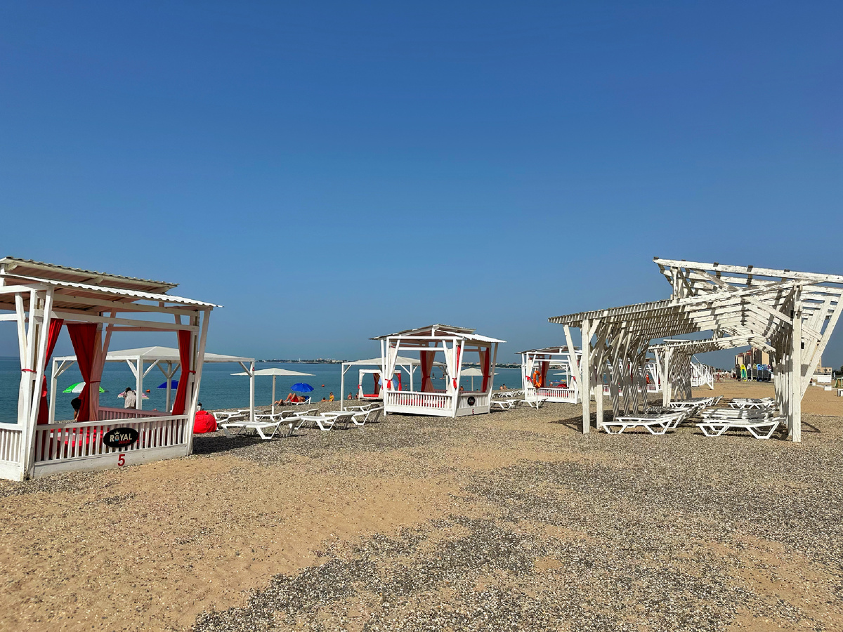 Вот и подошла к завершению наша поездка в Евпаторию, сегодня расскажу про наш последний день и мы отправляемся домой, в Кастрополь. Утром мы решили все-таки посмотреть, что за пляжи находятся на Симферопольском шоссе в Евпатории. Сначала заехали на пляж «Роял», время было 9:30 утра, народу очень мало. Пляж песочно-галечный, по ценам на бунгало и лежаки не узнавала. Из-за чего мы приехали на этот пляж — это качели в море. На них уже качались дети, да и были уже все мокрые, поэтому мы не стали на них фотографироваться. Я купаться вообще не планировала. Зато мы с Алиной нашли качели на берегу и пока Андрей ходил по съемкам, мы качались. В скопом времени рядом с качелями Асад открываться прокат машинок и я быстро Алину оттуда увела. Вернулись немного обратно и попали на пляж «Золотые пески». Я не поняла почему он так называется, пляж тоже Галька с песком, у воды одна галька, а в море снова песок. Здесь я уже не выдержала и пошла переодеваться в купальник, было так жарко, что мы все таки ок