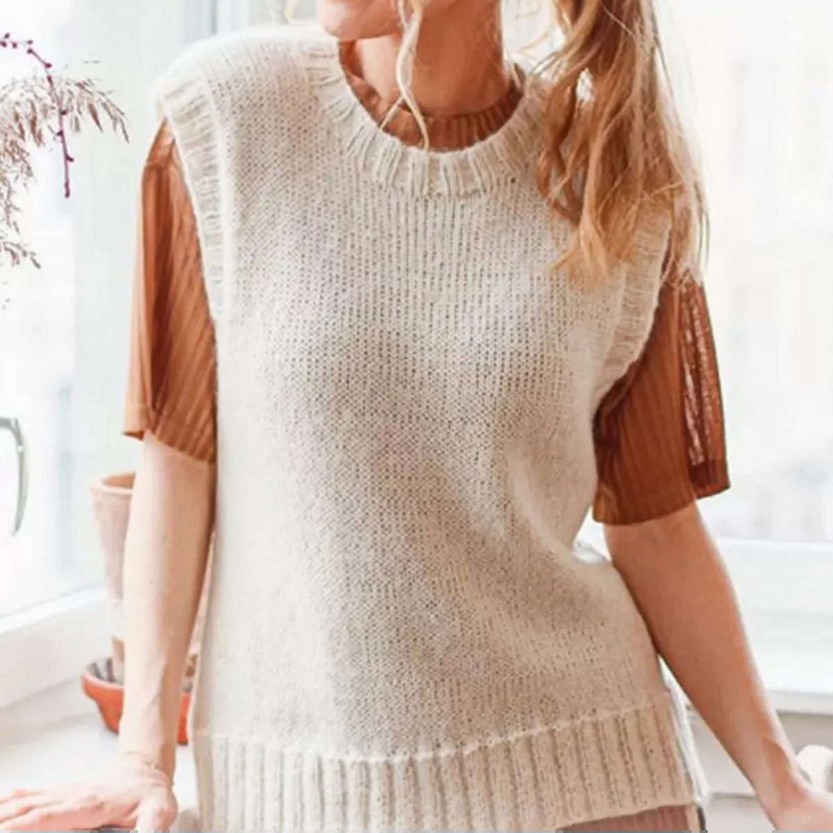 Молочно-белый жилет с разрезами по бокам. Обычная вещь становится предметом желаний, если ставки высоки: мохер, шёлк, невесомая шерсть альпака — и всё это в изысканном оттенке белого. Модель состоит из двух деталей, связанных лицевой гладью поворотными рядами. Вырез горловины, проймы и низ изделия оформлены резинкой. Благодаря классическому прямому силуэту жилет подойдет к любому образу.