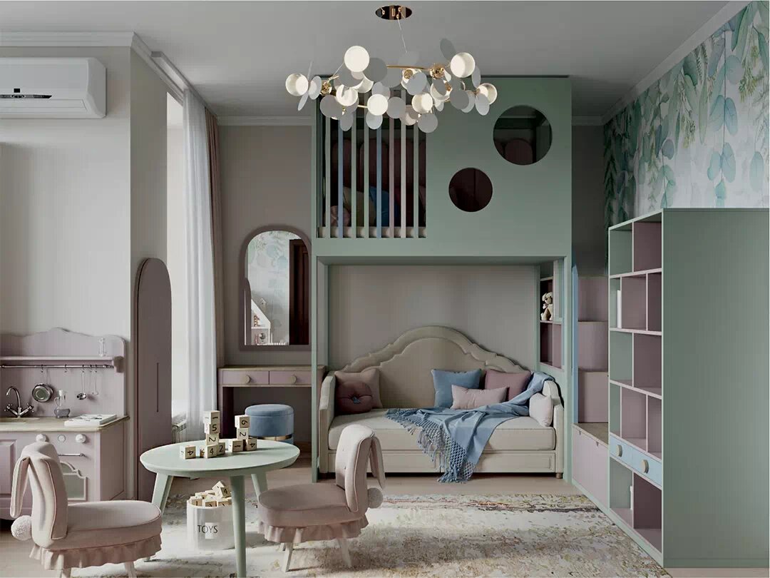 Дизайнерская мебель для комнаты маленькой девочки 2 лет с местами для отдыха, игрушечной кухней, туалетным столиком, ТВ.