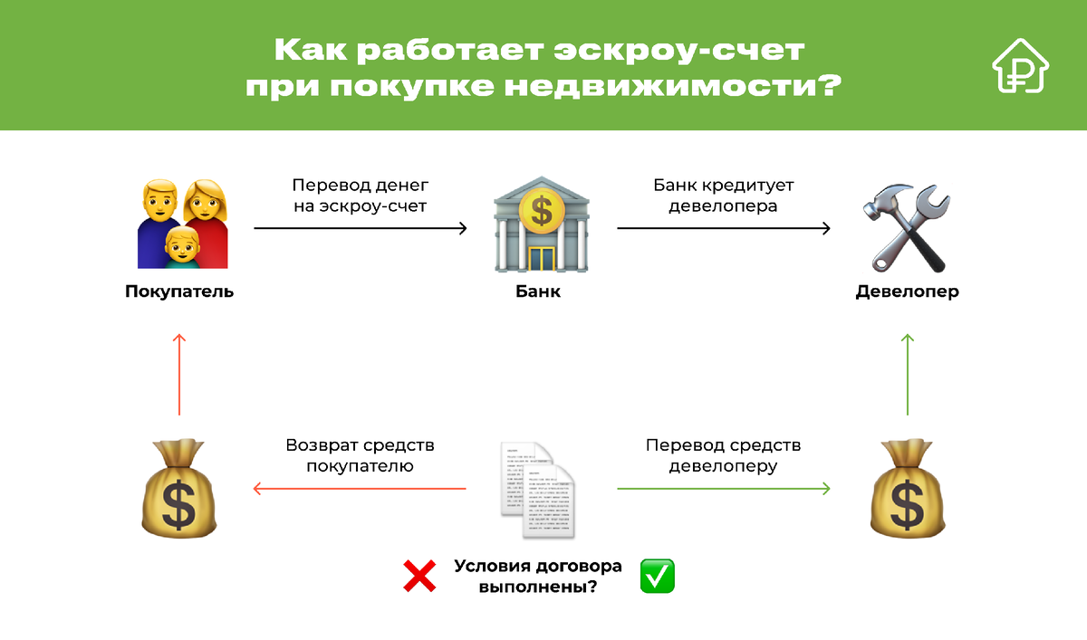 Покупатель самостоятельно переводит средства на эскроу-счет, используя ипотеку или личные сбережения. Во время строительства застройщик и покупатель не имеют доступа к деньгам, а банк выступает гарантом сделки. Средства замораживаются до завершения строительства и сдачи квартиры, тем самым защищая интересы всех сторон. Только после ввода объекта в эксплуатацию банк переводит средства застройщику, а покупатель получает ключи от квартиры. ➕ Плюсы эскроу-счета: