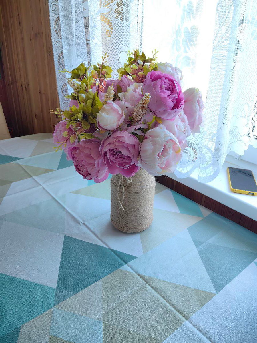 Продолжаю серию постов про обзор моего деревенского дома. На данном этапе эта статья будет последней, так как только на кухне еще есть следы готовых работ, а показывать другие помещения без вышивки мне кажется не интересным. А начну я с невышивальной темы. Уж очень мне захотелось украсить интерьер кухни цветами. Люблю пионы, но есть несколько НО: Речь тут, конечно идет о цветах, срезанных с клумбы, а не купленных за космические суммы. Поэтому выбор пал на искусственные цветы. Тем более, что их сейчас делают так, что не отличить от настоящих. И вот пришли долгожданные букеты (их тут два). Но незадача.... моя ваза их не выдерживает, они тяжелые. Покупать отдельную я не хотела, поставила в банку от огурчиков "Дядя Ваня". Думала временно, пока из города не привезу подходящую вазу. Но руки же не для скуки и у меня из ...на и палок, а точнее из скотча и шпагата вышла очень даже симпотиШная вещица. А вот так все начиналось: Результатом я осталась довольна, поэтому необходимость в вазе отпала.