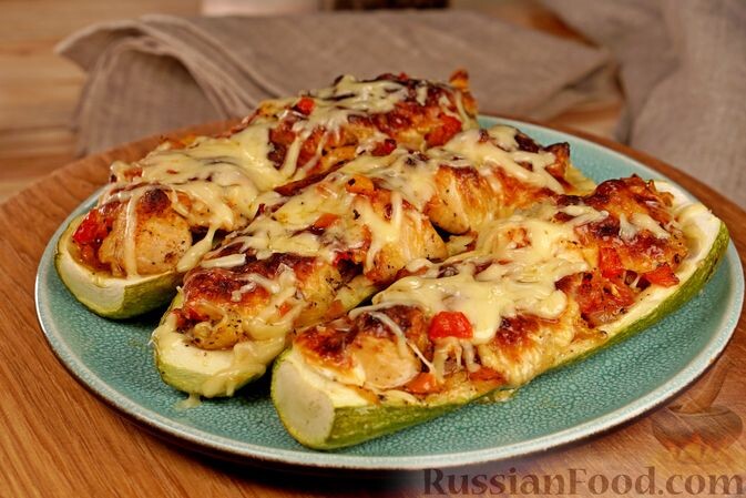 Лодочки из кабачков с курицей. Кускус с кабачком, перцем и морепродуктами. Суп-пюре из кабачков и картофеля. Печень с кабачками и картошкой. Салат из кабачков с огурцами и яйцом. Кускус с молодым кабачком, перцем и морепродуктами готовится быстро. Благодаря кабачку и сладкому перцу кускус получается очень сочным. Морепродукты и бальзамический уксус придают блюду нотки средиземноморской кухни. Суп-пюре из кабачков и картофеля получается особенно вкусным благодаря предварительному обжариванию овощей. Варится суп на овощном бульоне. При подаче дополняется обжаренными кружочками кабачка и зеленью, поэтому выглядит весьма аппетитно. Куриная печень, тушенная с молодыми кабачками и молодой картошкой, готовится несложно и недолго. Сперва печень обжаривается с луком и морковью, а затем тушится вместе с картофелем и кабачками в той же сковороде. Получается сочно и ароматно. Салат из свежих кабачков с маринованными огурцами и яйцом привлекает внимание многогранностью вкуса. Свежие молодые кабачк