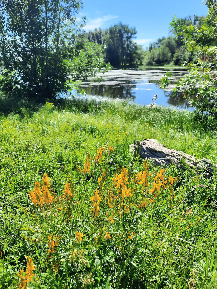 Сегодня у меня по гороскопу такое предсказание "Между общением и уединением выберите сегодня второе". Ну я так и планировала - прогулку в луга! А ещё сегодня День записывания случайных мыслей. Да, вообще, все мысли, что возникают в наших головах - случайны, хоть записанные, хоть не записанные. Даже, если идёшь по лугу одна, они роятся в голове, как пчёлы, нажжуживают нужное и ненужное. Но чаще других на природе повторяется мысль "Господи, как хорошо-то!" Несмотря на раннее утро, уже было жарко и безветренно и почти безоблачно Решила, что иду просто любоваться природой, никакой земляники. Но, на всякий случай крошечное ведёрко взяла, чтоб уж потом не жалеть, что не взяла. И, да, земляники, по-прежнему много, но она уже очень спелая и при сборе раздавливается в руках. А листья уже покраснели на солнце Старалась не наклоняться и не искать, но как устоять, если попадалась такая крупная? А какая душистая! Цветочный ковёр стал более многоцветным, сейчас цветёт Самыми пахуч