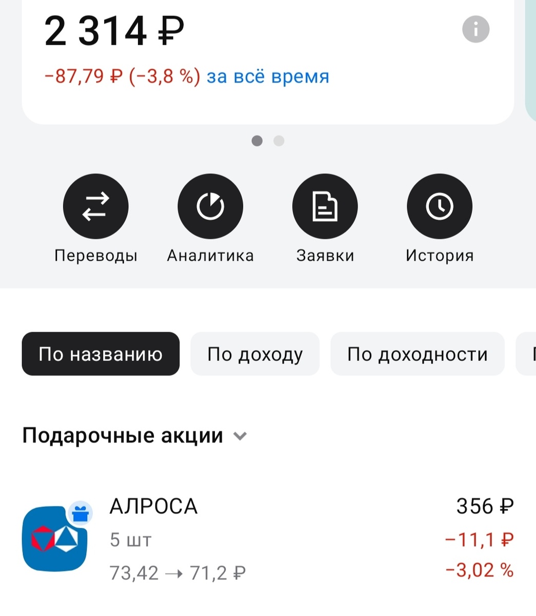 Воздушный портфель состоит из двух частей - Тинькофф и Альфа ( 2 314₽ в Альфе и 26 816,14₽ в Тинькофф)