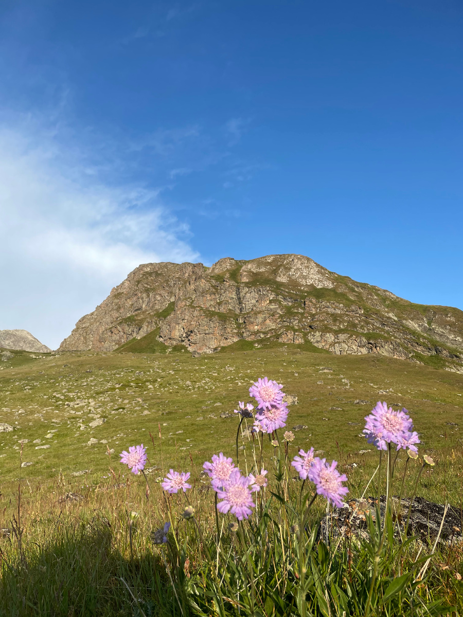 1️⃣8️⃣ День приключений на Кавказе. Самый красивый день по горам Архыза. Надо дойти до пяти озёрья !!! Всего 16 км. Вечером выяснится, что 22 прошла!!! Чилик отпадает, так как к нему спуск, а потом подъем не хилый. Утром наведывалась к озёру Кяфар. Пришлось спуститься ниже, чтобы увидеть всю красоту. Глубоко синего цвета большое блюдце среди скал. Заворожило. Но время летит, надо собираться и выдвигаться на перевал "17". Собралась быстрее группы и пошла не в лоб, а наискозь, пошла к ступенькам, как подсказал инструктор. Послушай инструктора и сделай наоборот, в этот бы раз сработало лучше. Куда я попала, огромные ступени вверх, ползу на коленях, вниз смотреть не могу страшно, пропасть, лететь вниз метров 50. Рюкзак сняла, он тянул назад, боялась упасть. Так и пошла на корячках, реву и тяну рюкзак за лямки и молю Господа, чтоб не оторвались. Трава и камни помогали. Продолжался подъем на коленях около часа. А инструктор пошел по другой тропе, по которой я хотела первоначально идти.