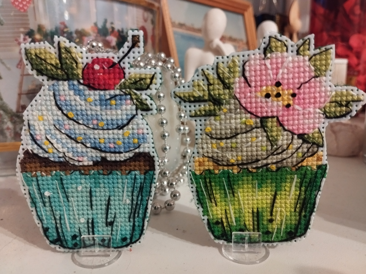 Ура! Доделала наконец-то второй кексик из бесплатного СО "Летние кексы". Дизайнер Eva Stitch. 41 цветов ДМС, Зашивка неполная. Группа Волшебная Мельница|Вышивка крестом от Eva Stitch. Кексики шью на пластиковой канве белого цвета. Ниточки - аналог ДМС с Вайберис. Сразу оформила самоклеющимся зеленым фетром. Теперь стоят на подставочке. Смотрятся они вместе здорово! А ягодку хочется съесть