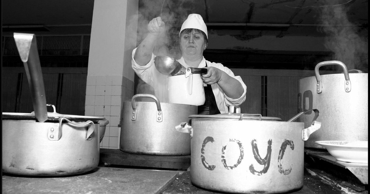 В кухне уже мыли посуду; стучали котлы и кастрюли, густо и душно шёл влажный пар. В окошке раздачи никого не было, и Славка нетерпеливо застучал ножом по жестяной тарелке. Рядом собирала грязную посуду тётя Женя: «Тебе чего? Оголодал? Сейчас я тебе добавочки плесну»…